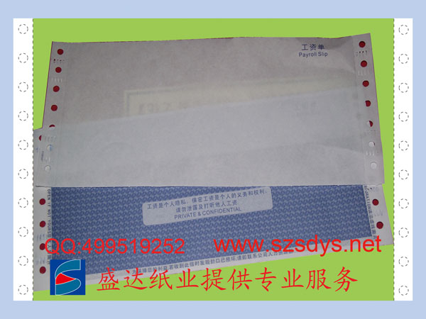 工艺:通用工资条纸为一份三联无碳纸,纸质有55克及80克任客户选择,通用工资条纸版面内容可按客户要求排版,印刷上单位标志及单位名称中英文、注意事项等要求内容。常用尺寸为:93*217mm、140*241mm。四周通过有色胶粘接、正反面通过印刷保密底纹、保密效果好。通过对电脑纸涂胶粘合及相关部位的增感油墨或减感油墨的印刷,实现员工薪酬明细信息的保密。有多种版式、保密花纹可选用,通过针式打印机套打使用。通用工资条纸具有无碳复写、电脑连续打印、私人信息保密功能。为确保通用工资条纸在传递或邮寄时的保密,收件人必需沿三边刀位撕开此产品,方能审阅内里的资料。