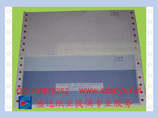 盛达纸业专业订制:密码纸工资条。此产品选用高级无碳木桨原纸。纸质平整,复写显色效果好,采用全新进口表格印刷机配套进口高品质环保油墨及胶水生产。具有保存时间长、电脑孔位标准、打印顺畅、不易卡纸、印刷版面干净、清晰,显碳效果好等优势。